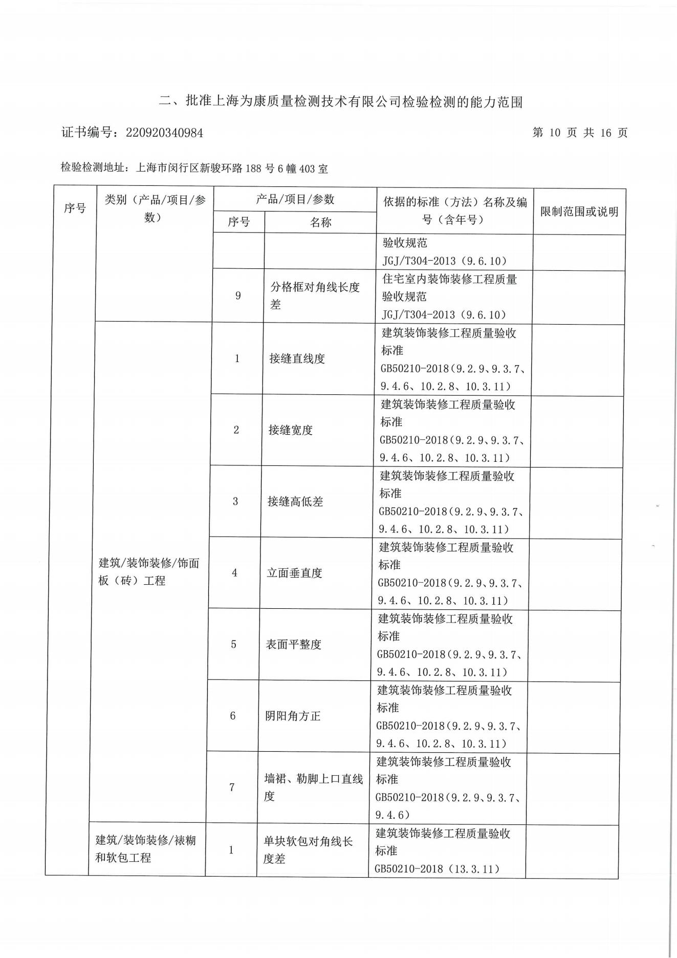 分戶驗收要求 分戶驗收:即交房前依照相關標準對區域內住宅逐套進行驗收。自2009年10月1日起所有上海市住宅工程強制實施分戶驗收。《上海市工程質量分戶驗收管理規定》住宅工程竣工驗收前必須依照《住宅工程套內質量驗收規范》DG/TJ08-2062-2009和現行工程質量標準、規范,對每戶套內的觀感質量、使用功能及使用安全進行驗收。凡未實施分戶驗收的,該工程項目將不得交付使用;服務范圍 一、裝修房全過程跟蹤檢查:從毛坯到裝修結束全過程跟蹤檢驗;對隱蔽工程施工進行檢測;對裝飾 材料進行控制;每個施工節點作好原始記錄并提出整改意見;待整改結束進行復查,直至符合 要求;最終每戶出具一份檢測報告。 二、裝修房竣工驗收:主要對安全、使用功能及表面觀感質量進行檢測;每個施工節點作好原始記錄并提出整改意見;待整改結束進行復查,直至符合要求;最終每戶出具一份檢測報告。 三、毛坯竣工驗收:主要對安全、使用功能及表面觀感質量進行檢測;每個施工節點作好原始記錄并提出整改意見;待整改結束進行復查,直至符合要求;最終每戶出具一份檢測報告。 四、個人交房驗房檢測。 建設工程分戶驗收檢測參考標準 DG/TJ08-2062-2017 《住宅工程套內質量驗收規范 》 DB/T 31/30-2003《住宅裝飾裝修驗收標準》 GB50209-2002《建筑地面工程施工質量驗收規范》 GB50210-2001《建筑裝飾裝修工程質量驗收規范》 GB20242-2002《建筑給排水及采暖工程施工質量驗收規范》 GB50300-2001《建筑工程施工質量驗收統一標準》 GB50303-2002《建筑電氣工程施工質量驗收規范》 套內質量檢測(一房一驗)內容 檢測內容 建筑尺寸 室內地面:水泥砂漿地面、木、竹地板,板塊地面 室內頂棚:頂棚抹灰、吊頂工程 室內墻面:墻面抹灰、飾面板(磚)墻面、涂飾工程、裱糊工程、軟包工程 建筑門窗 樓梯與護欄 細部工程:櫥、柜,窗簾盒、窗臺板、門窗套、可折裝式隔斷、淋浴房 給排水與燃氣:室內給水、室內排水、衛生器具、燃氣管道 通風與空調:送排風和防排煙、空調工程、 室內電氣:燈具安裝、開關、插座,分戶配電箱、室內配線、等電位聯結 弱電工程:有線電視安裝工程、電話、信息網絡安裝工程,訪客對講安裝工程、安防報警系統 太陽能熱水系統 室內環境評價
